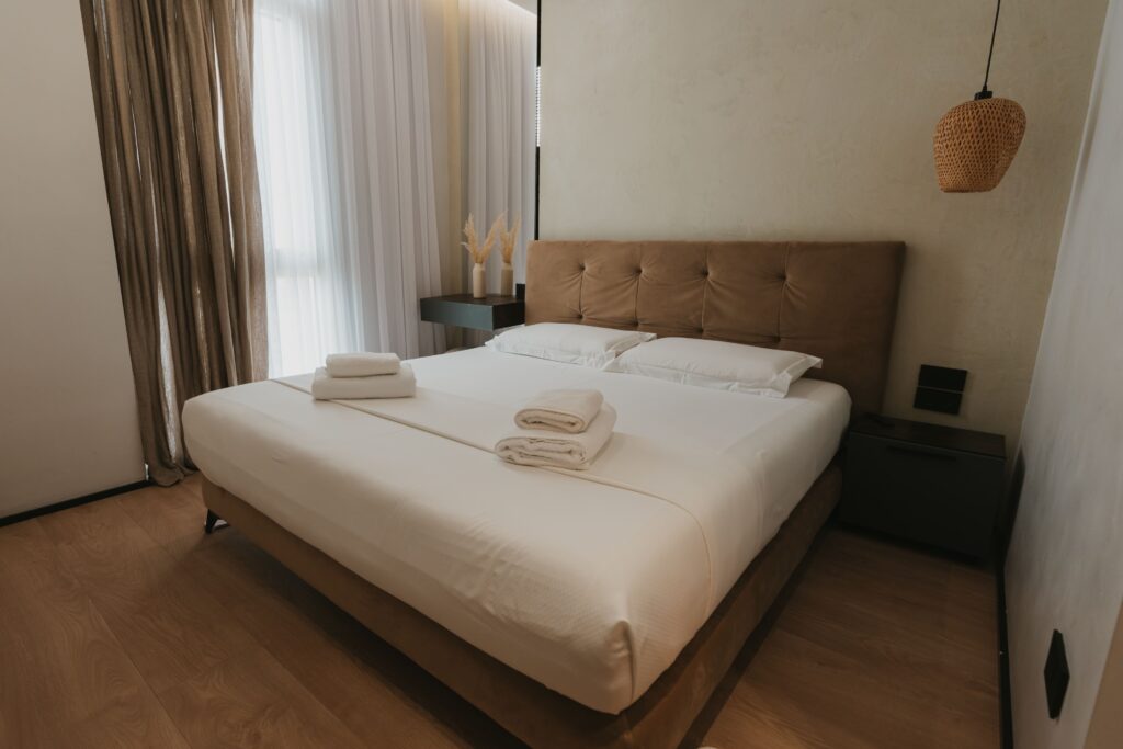 Kjo dhomë standarde, ideale për dy persona, është dizajnuar për të krijuar një atmosferë të ngrohtë, intime dhe relaksuese, ku drita natyrale dhe freskia e bregdetit mbushin çdo cep.