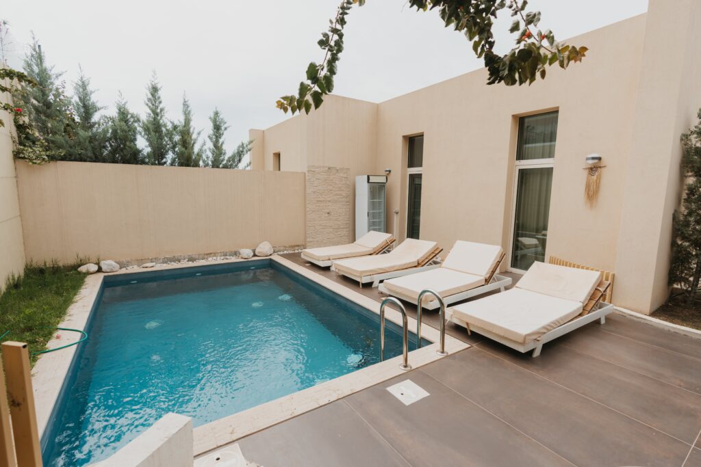 Pishina e vilës, e rrethuar nga gjelbërim dhe e pozicionuar në mënyrë që të përfitojë maksimumin e dritës dhe pivatësisë, është vendi i përkryer për të shijuar ditët me diell apo perëndimet magjike me një gotë verë në dorë. Krevatët e diellit dhe hapësira për të shijuar drink-et e pasdites e bëjnë të përsosur për momente relaksi me familjen apo miqtë. Oborri ofron ambiente të dedikuara për relaks apo socializim.